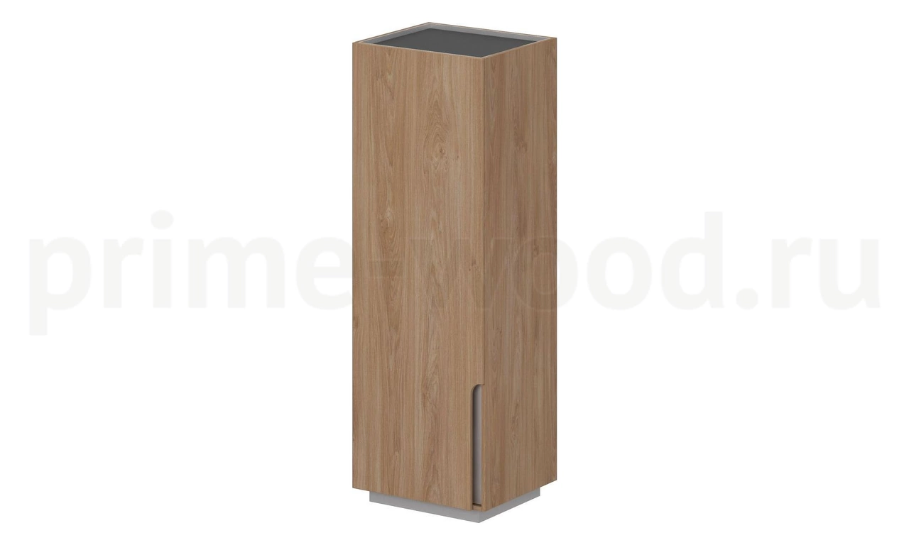 Шкаф на регулируемых опорах с 1-м распашным фасадом. Шкаф имеет ориентацию - правый и левый. В секции за широким высоким распашным фасадом одна несъемная полка. Под полкой располагается штанга выдвижная. В шкафу присутствует присадка для установки трёх дополнительных полок (опционально). Присадка под полки с доп. перфорацией +- 32 мм. Наружные боковины и задняя стенка из ЛДСП 18 мм основного цвета в кромке ПВХ 2 мм только по верхнему торцу, текстура вертикально. Комплект из 3-х полок заказывается отдельно.